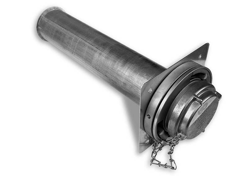 Bouche de remplissage avec plaque pour fixation murale et un tuyau de 50 cm avec colorete. Raccord universel : Storz A, couvercle métallique pour extérieur et chaîne.