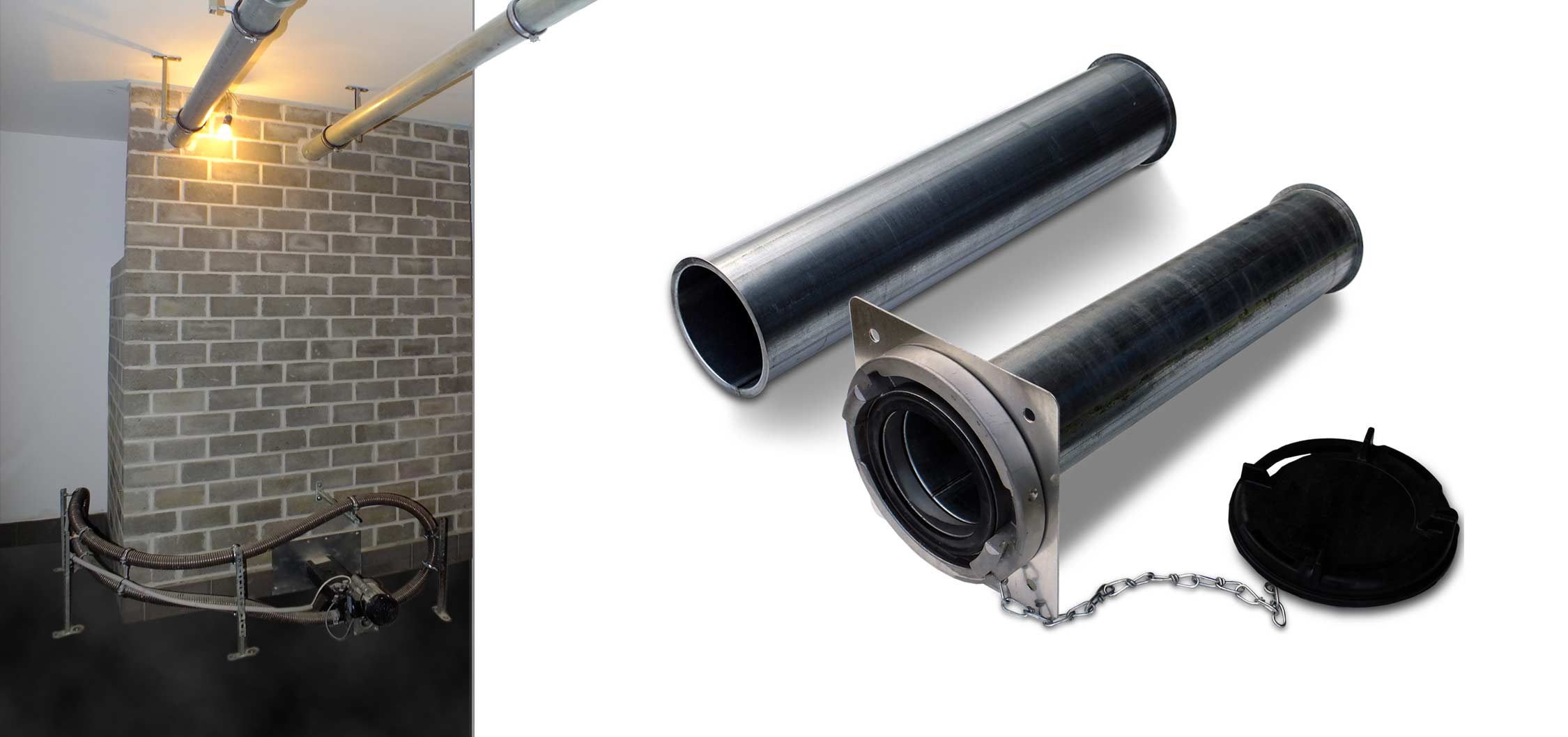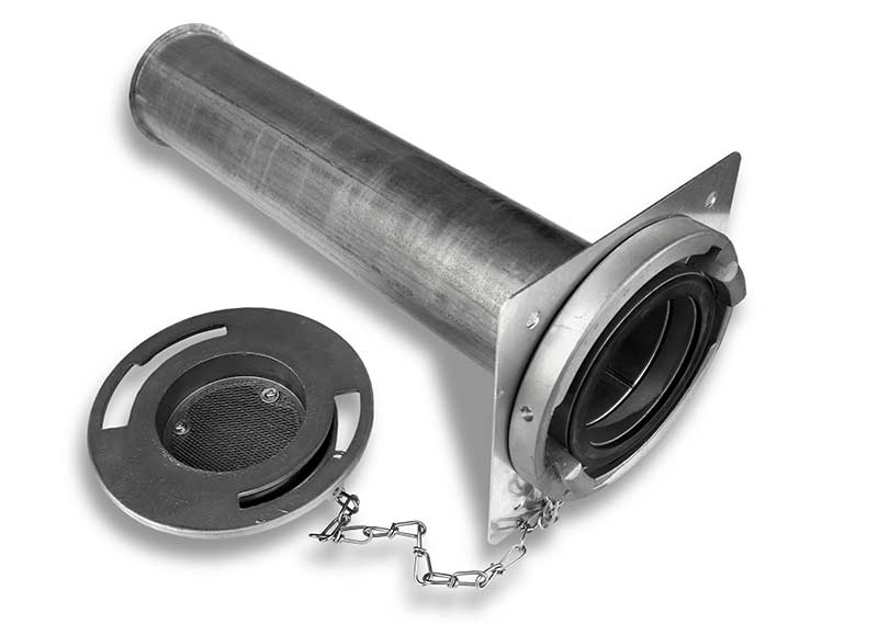 La gamme d'accessoires pour silo est fabriquée en acier zingué. Le diamètre des tuyaux est standard : 100mm. Les raccords, pour se connecter au flexible du camion sont universels en Europe : type pompier : Storz A. Les couvercles sont équipés d'une ventilation avec grille : quand la bouche est placée à l'extérieur. Si la bouche est placée à l'intérieur d'un bâtiment, en vissant la pastille, le couvercle devient étanche pour empécher le CO de sortir du silo. Chaque élément a une collerette à ses extrémités. Un anneau de serrage et un joint caoutchouc garantissent une bonne étanchéité entre deux éléments connectés. Prévoir un anneau à chaque élément.